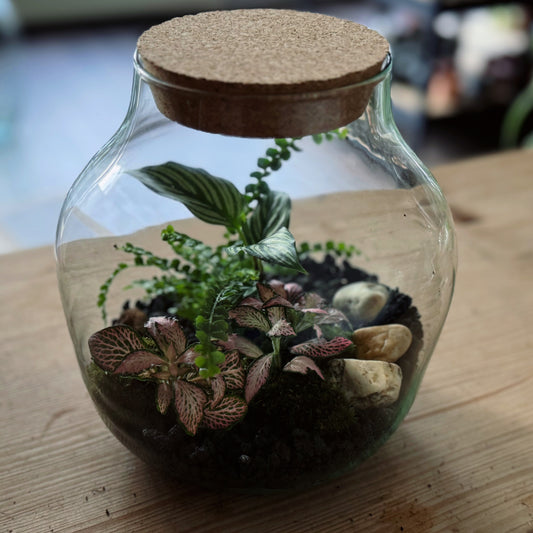 Flaschengarten DIY Set No83 Goeppertia elliptica 'Vittata' x Nephrolepis cord. 'Duffy x Fittonia 'Pink Forest Flame'