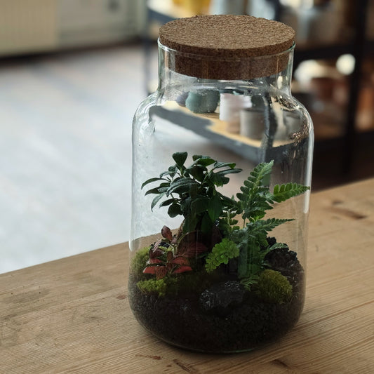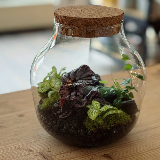 Ein Flaschengarten ist ein geschlossenes Pflanzensystem, das sich selbst reguliert. Durch den natürlichen Wasserkreislauf im Glas benötigen die Pflanzen kaum Pflege: