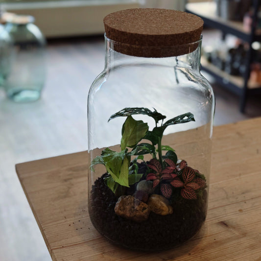 Flaschengarten DIY Set No30 - Monstera obliqua ‘Peru‘ x Fittonia 'Zalm Forest Flame' x Selaginella uncinata x Onyx