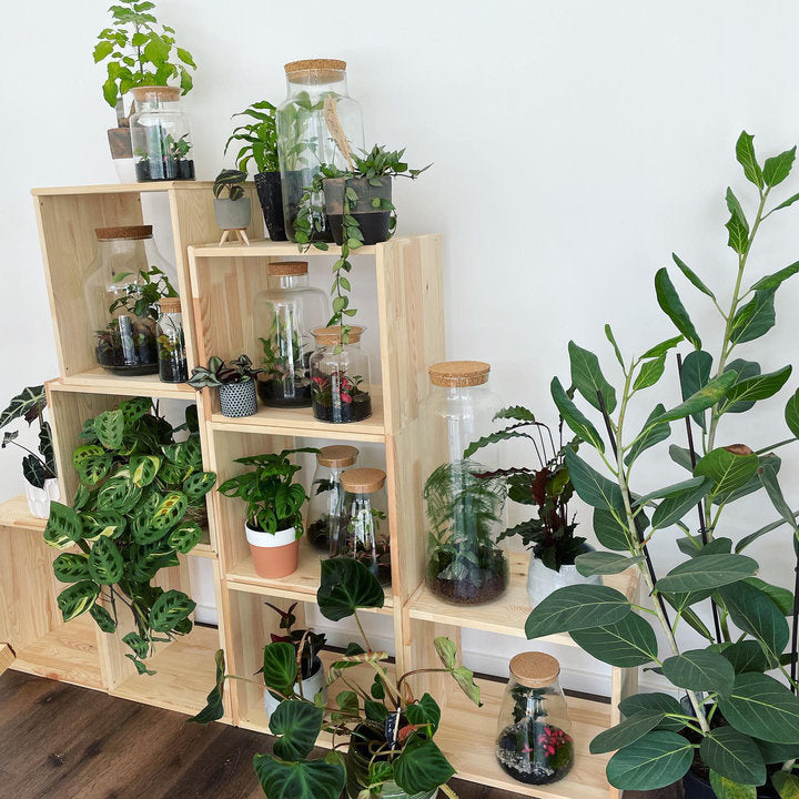 Unsere Mini-Pflänzchen könnt ihr natürlich auch in einem Übertopf in die Wohnung stellen. Außerdem haben wir einige größere Pflanzen im Laden, die nicht für Flaschengärten gedacht sind.