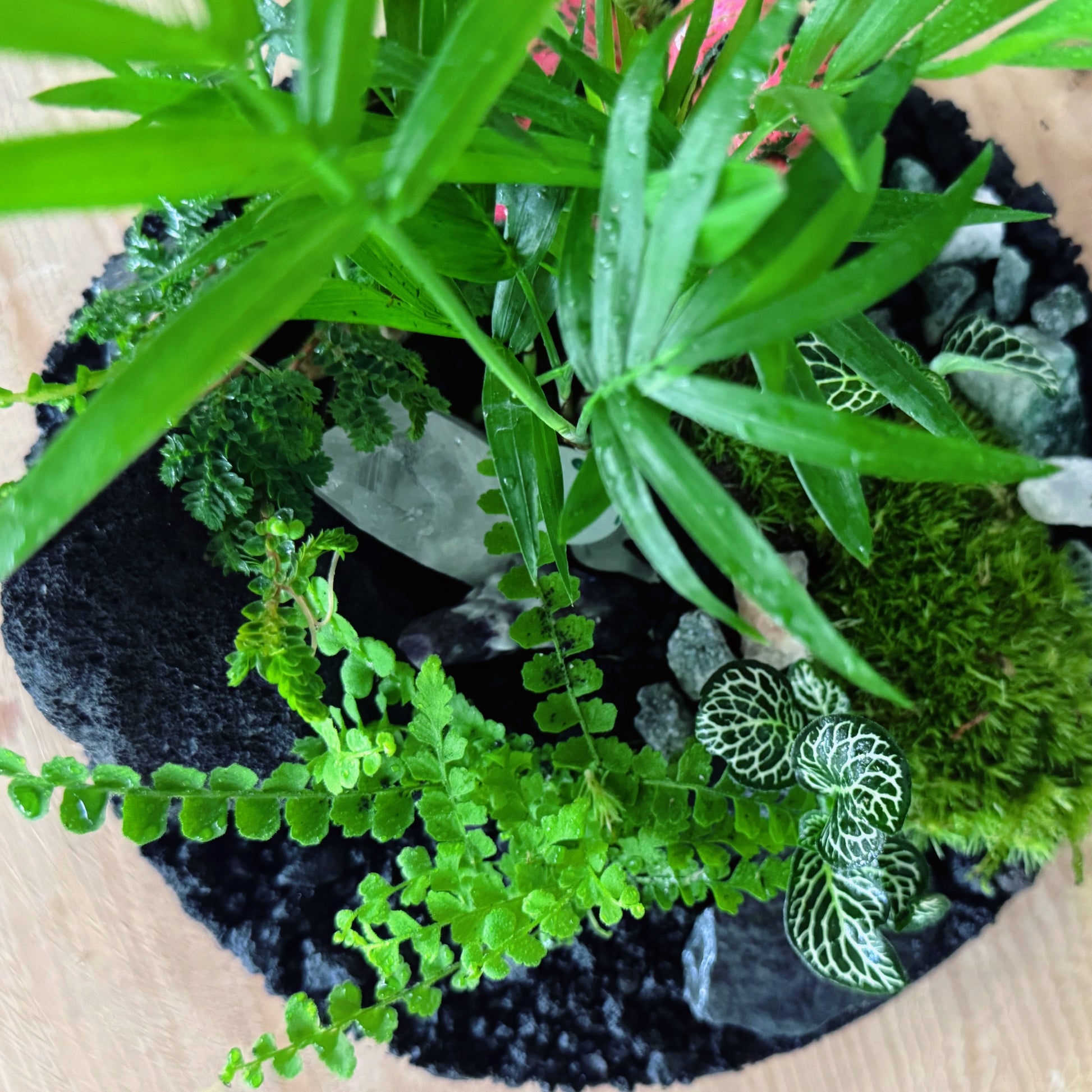 Die Bergpalme ist die einzige Pflanze, die in einem Topf mit Erde geliefert wird. Sie ist sehr pflegeleicht, sollte ebenfalls hell, aber ohne direkte Sonne stehen. Der Boden darf gleichmäßig feucht, aber nicht nass sein.