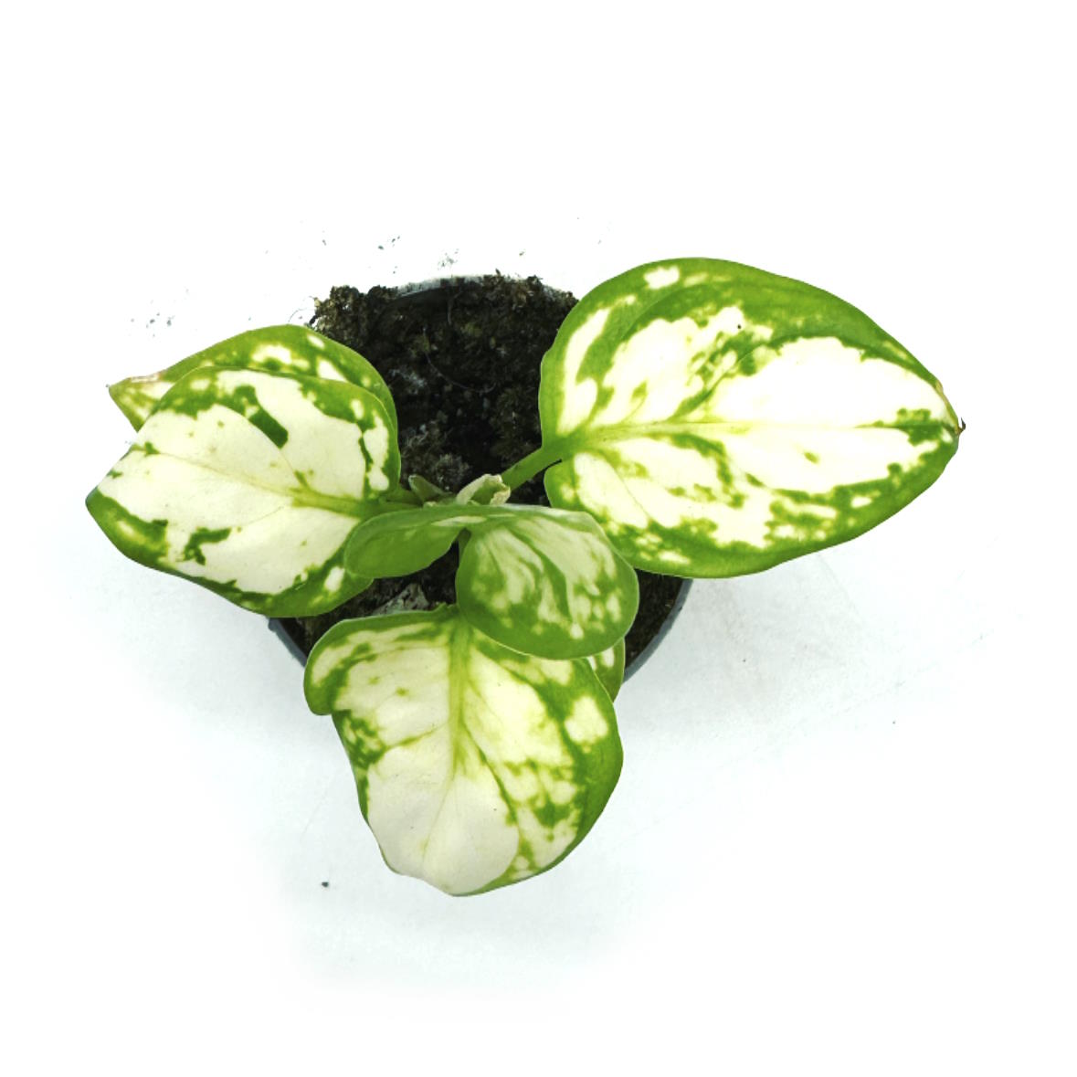 Die Blätter haben eine Grundfarbe von hellem Grün oder Creme mit einem markanten weißen Muster. Dieses Muster kann variieren und kann kleine bis mittelgroße weiße Flecken oder Streifen auf den Blättern aufweisen, die ihnen ein ‚schneeflockenähnliches‘ Aussehen verleihen. Die Blätter sind breit, lanzettlich und glänzend. Das weiße Muster kontrastiert auffällig mit der grünen oder cremefarbenen Farbe der Blätter.