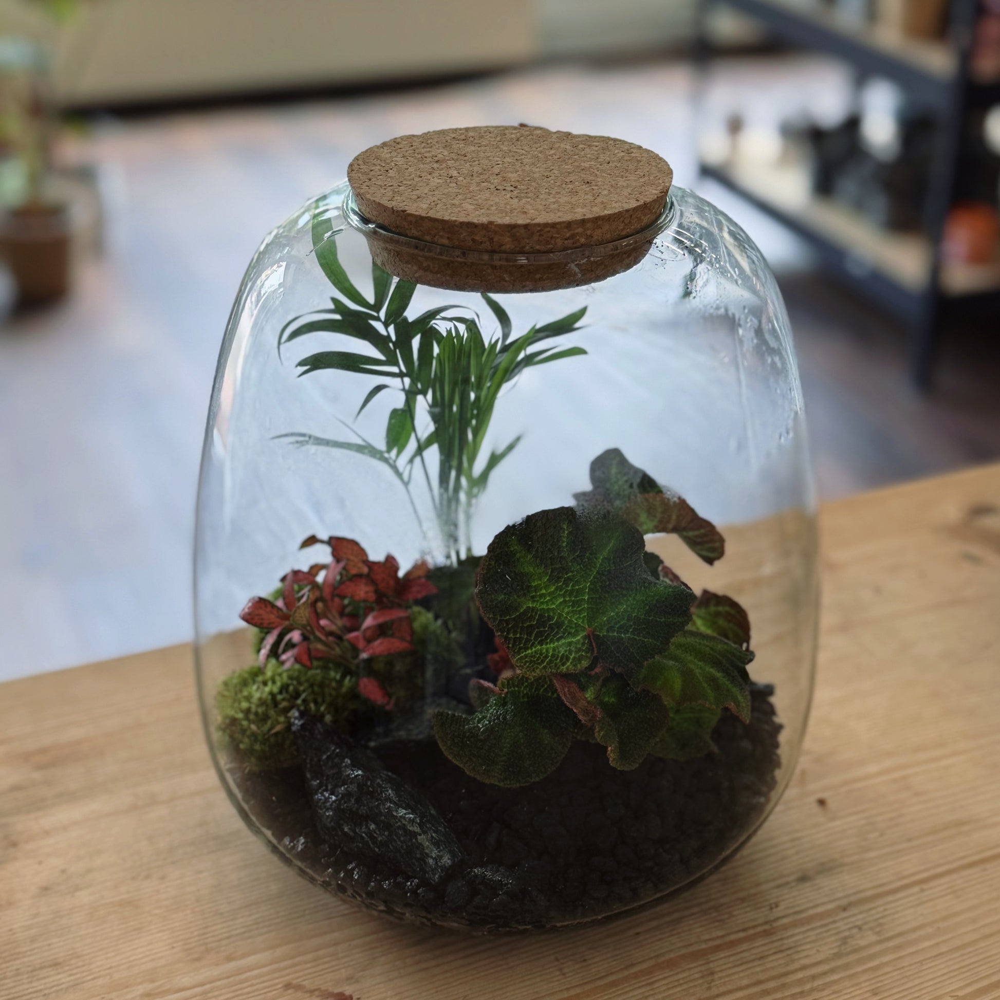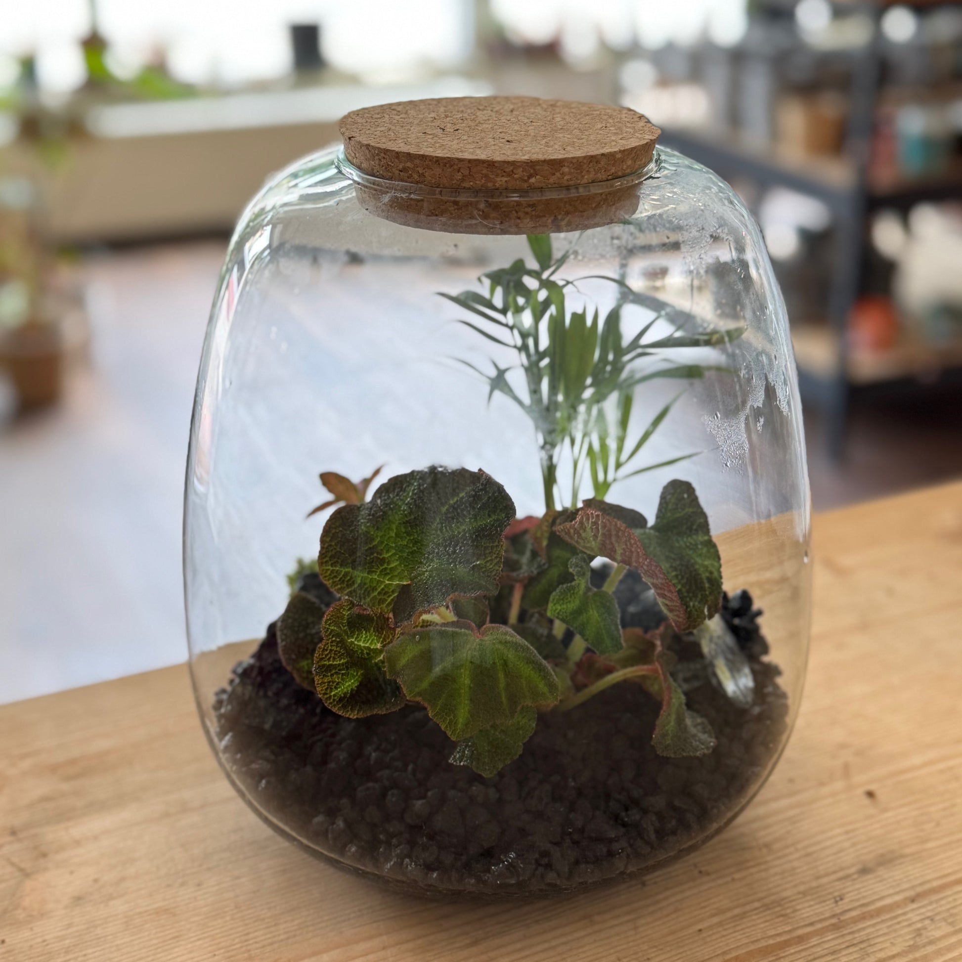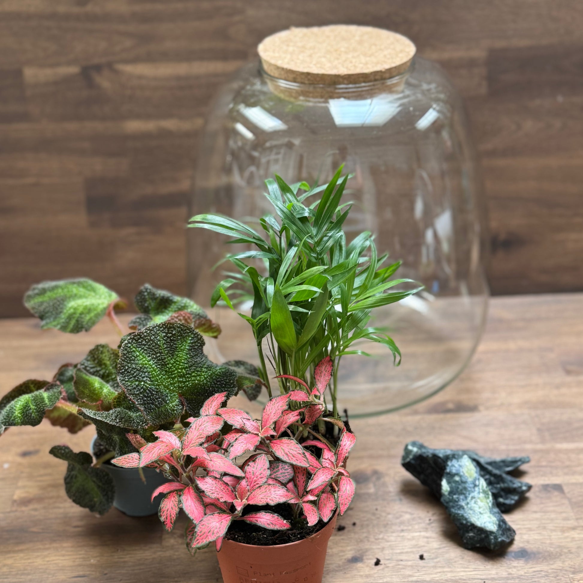 Flaschengarten DIY Set No57 - Begonia solimutata x Fittonia 'Forest Flame' x Chamaedorea elegans