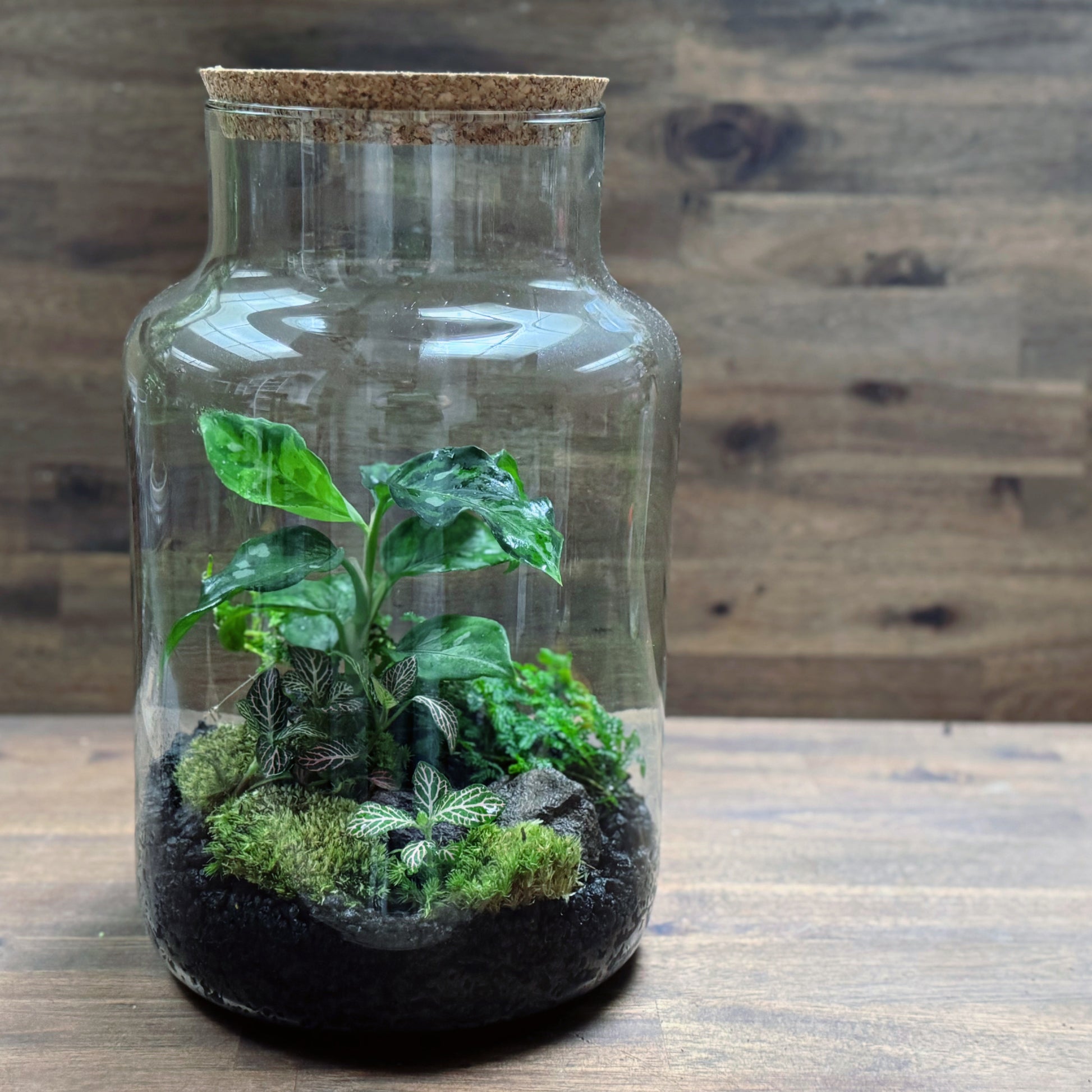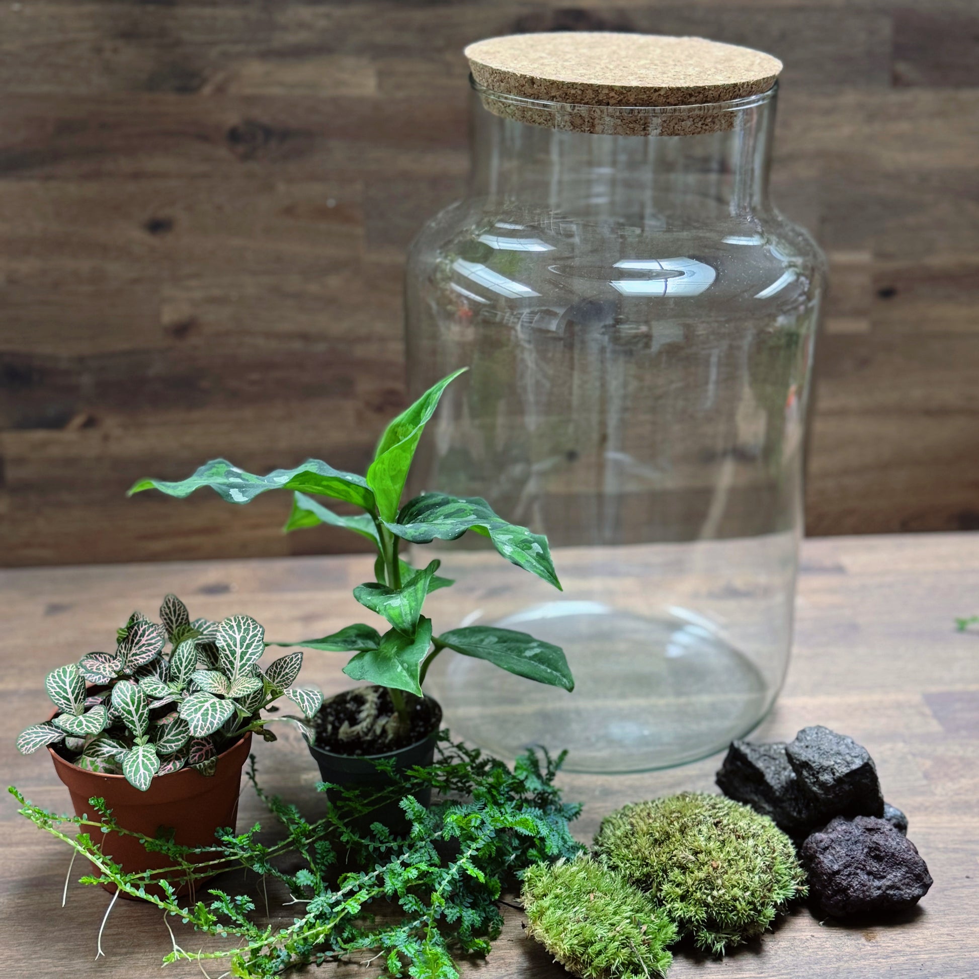 Flaschengarten DIY Set No69 - Aglaonema pictum 'Tricolor' x Fittonia Mosaic Mistral x Selaginella uncinata