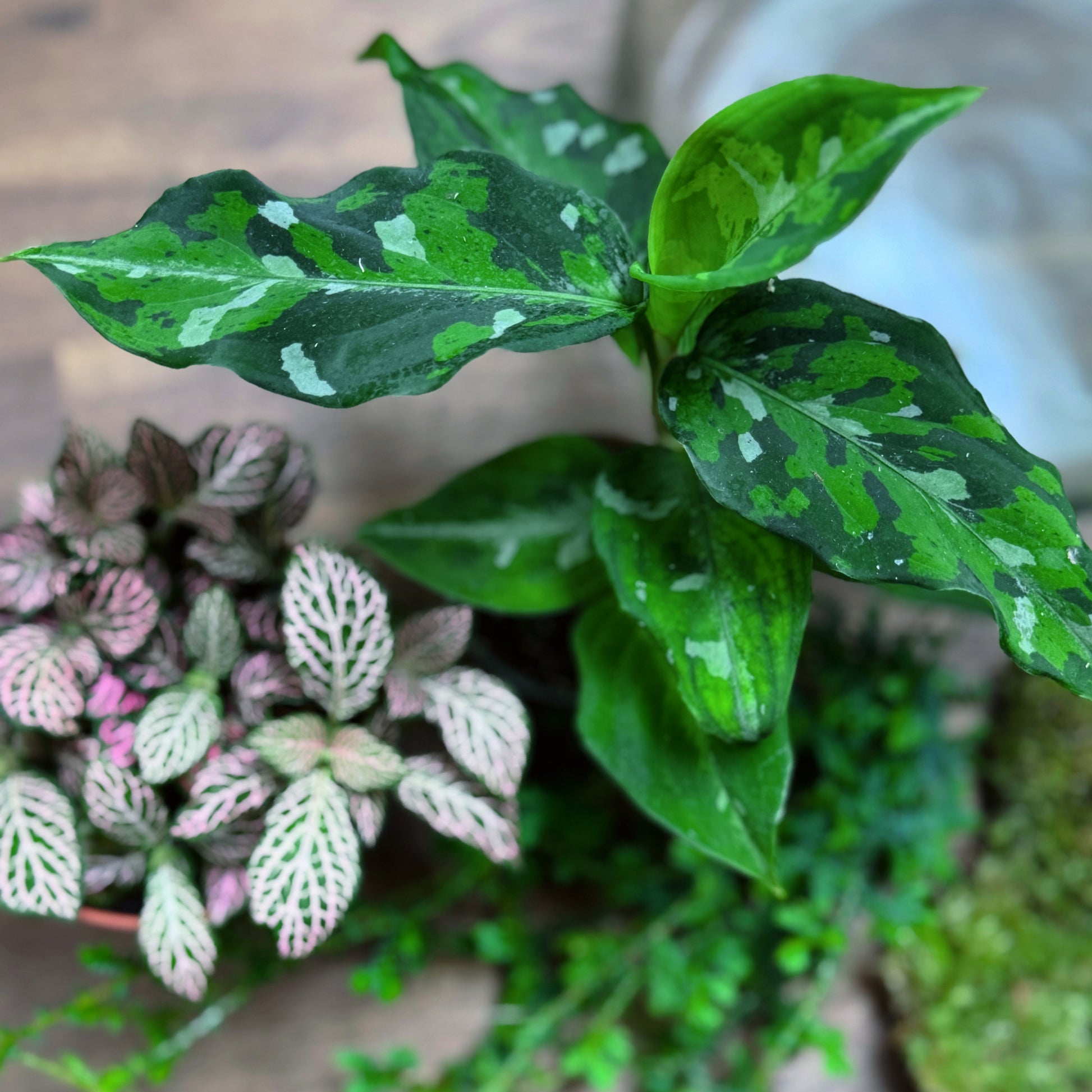 Gestalte deinen eigenen kleinen Dschungel mit unserer Aglaonema pictum tricolor, der schillernden Selaginella uncinata und der dekorativen Fittonia Mosaic Mistral. Drei Pflanzen, die sich perfekt ergänzen – für ein lebendiges, farbenfrohes Highlight in deinem Zuhause.