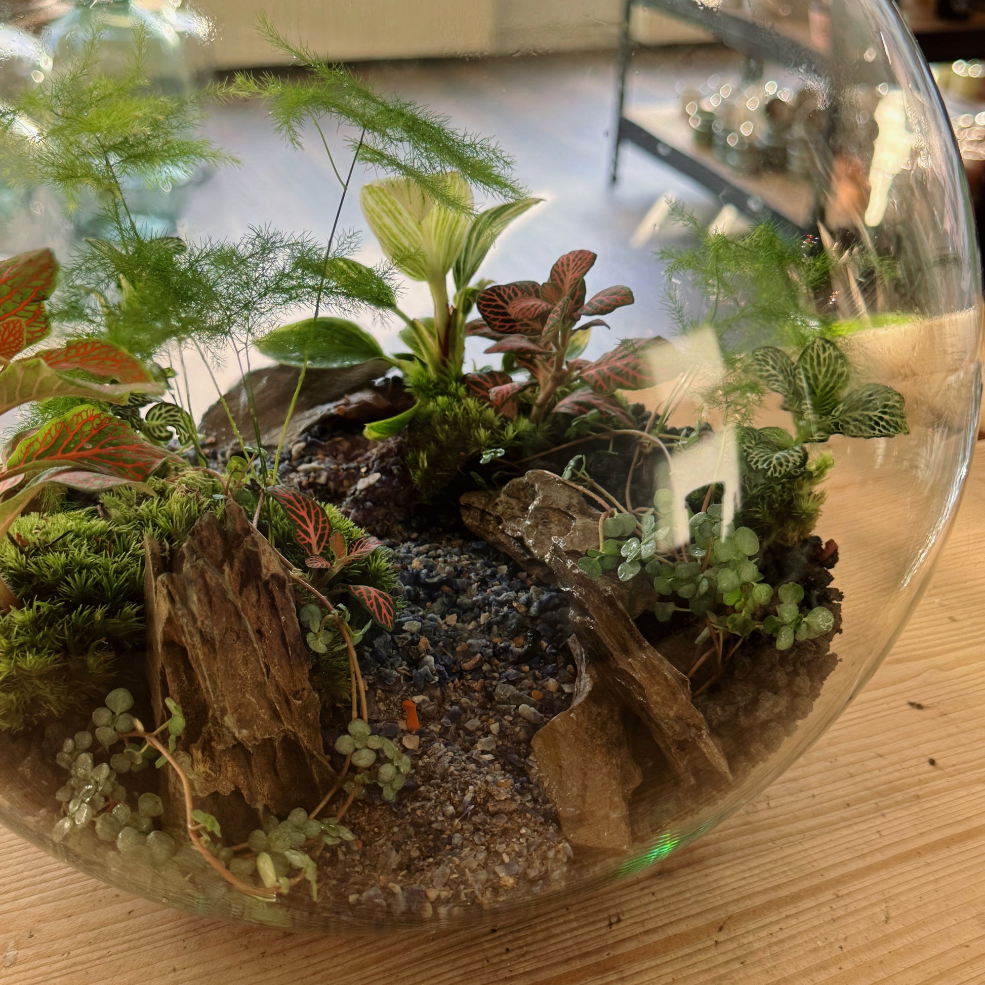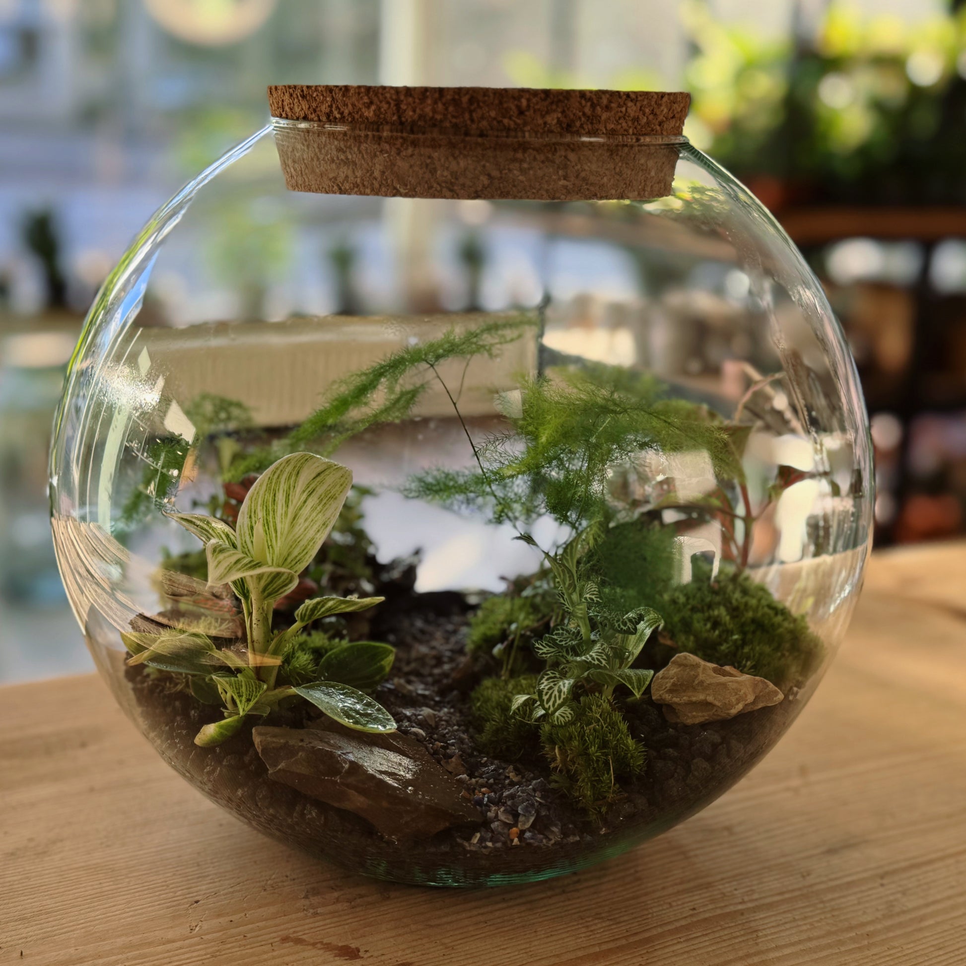 Dieses Flaschengarten-Set bringt nicht nur Grün in euer Zuhause, sondern auch eine richtig coole Landschaftsidee: Die große, elegante Kugelvase bietet viel Platz für kreative Mini-Welten – und das Highlight ist der enthaltene Sodalith-Split. Sobald dieser nass wird, färbt er sich intensiv bläulich. Perfekt also, um einen kleinen Fluss, Bachlauf oder eine blaue Lagune in eurem Terrarium zu gestalten. Ein echter Hingucker! Damit eure Mini-Landschaft auch botanisch spannend wird, enthält das Set vier harmonierende Pflanzenarten: