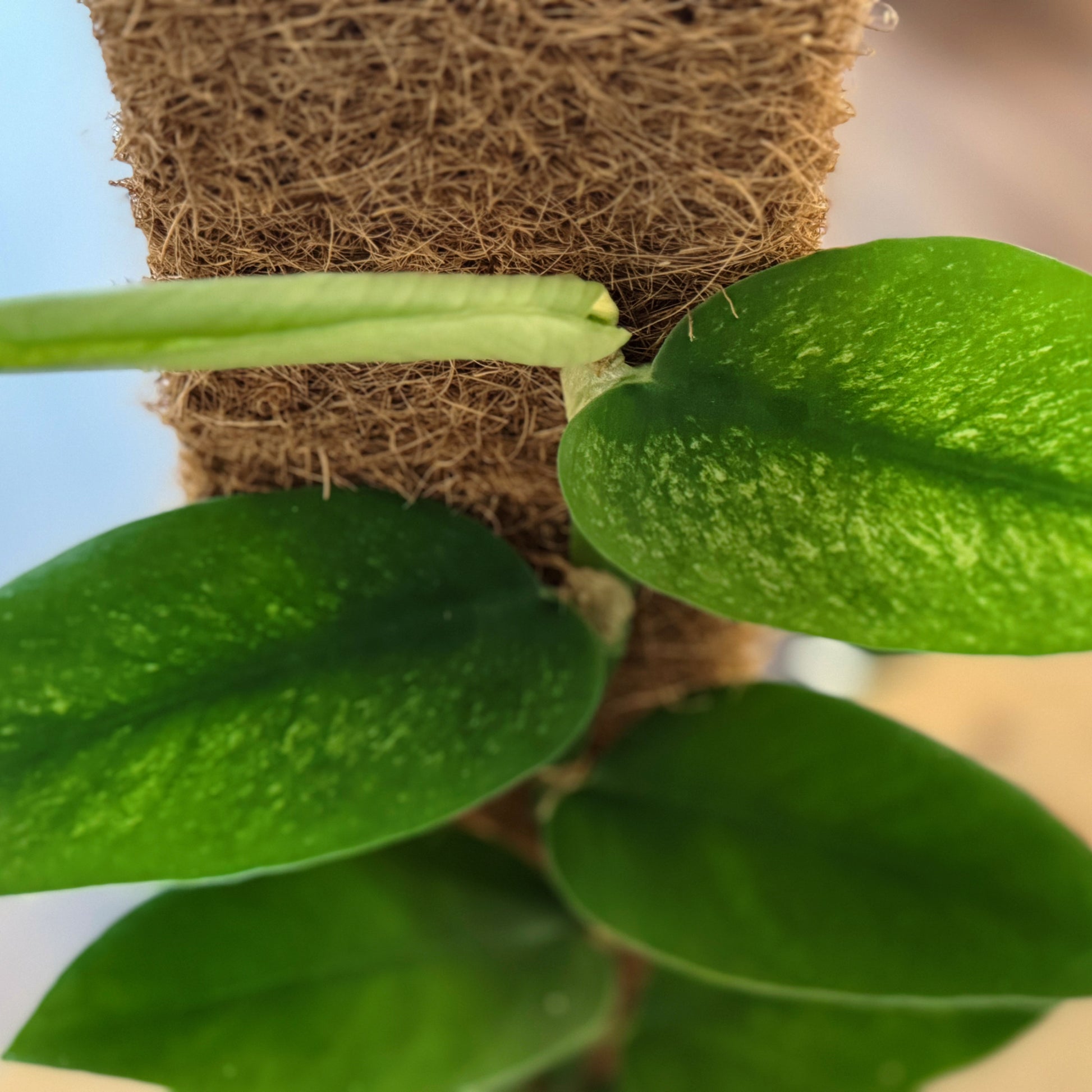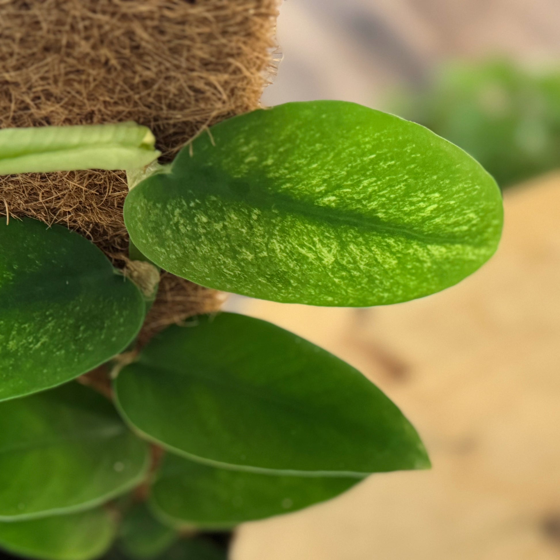 Rhaphidophora hongkongensis ‘Variegata’ ist eine seltene, kletternde Aroidenart mit attraktiver Panaschierung. Die lanzettlichen bis schmal ovalen Blätter erreichen Längen von 10 bis 20 cm und zeigen eine eindrucksvolle, fein gesprenkelte Musterung aus cremeweißen bis mintgrünen Bereichen auf dunkelgrünem Grund. Die Oberfläche ist glatt und leicht glänzend, die Mittelrippe deutlich ausgeprägt. Junge Pflanzen wachsen kompakt, mit zunehmendem Alter entwickeln sich längere, elegant rankende Triebe.